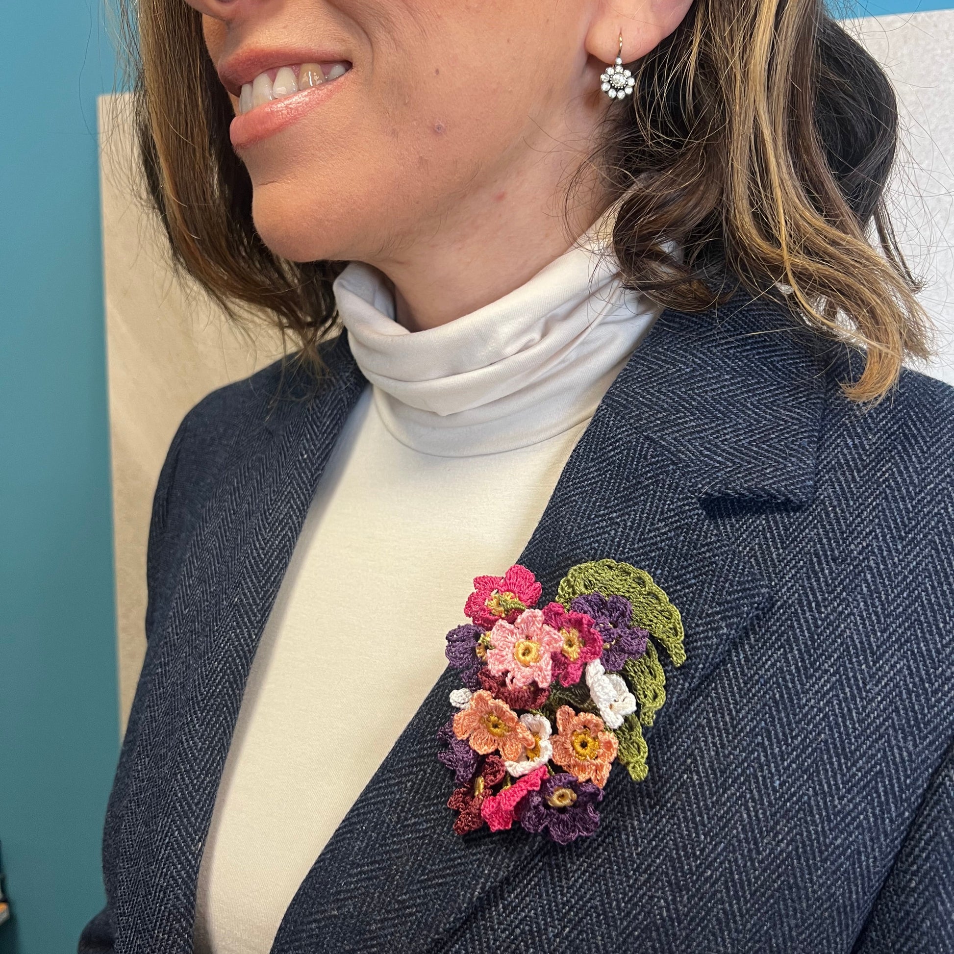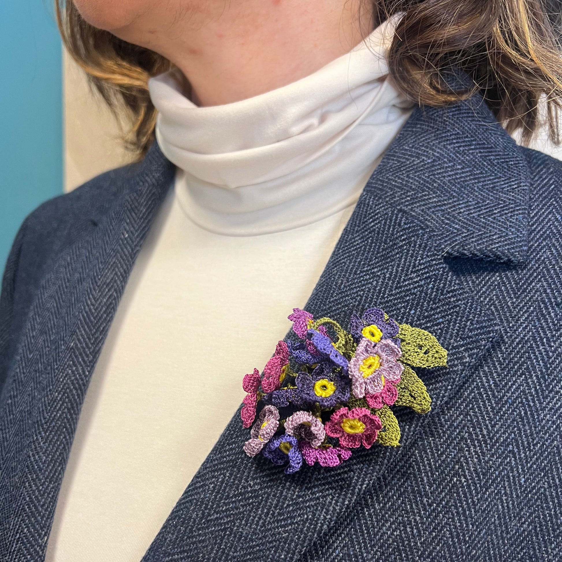 Küçük tığ oyası çiçeklerden oluşan bu el yapımı broş, geleneksel el işçiliğini zarif ve modern bir dokunuşla bir araya getirir.