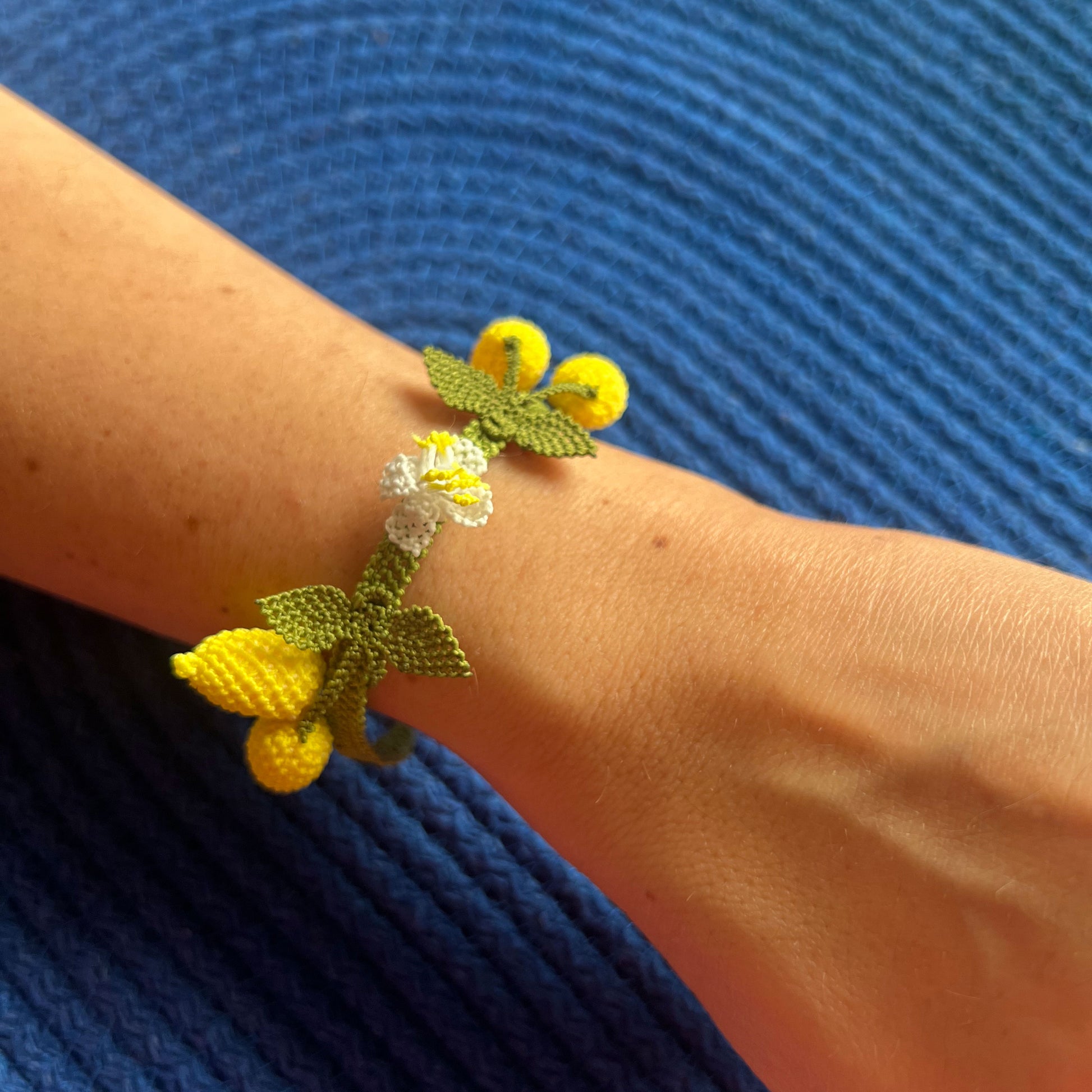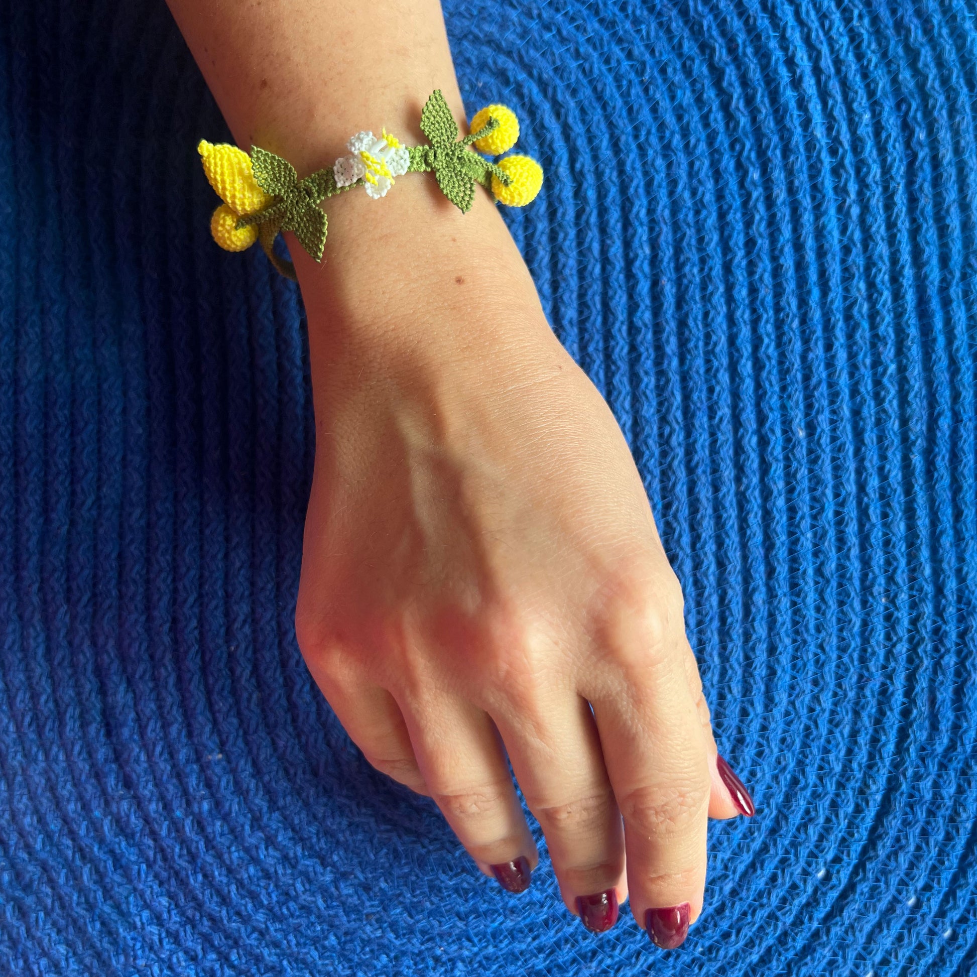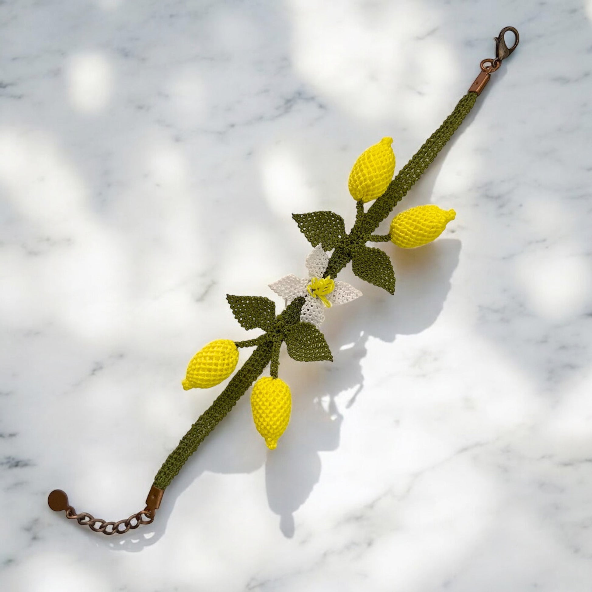 - Bu limon figürlü iğne oyası bileklik, Anadolu’nun yetenekli kadınları tarafından tamamen elde üretilmiştir.