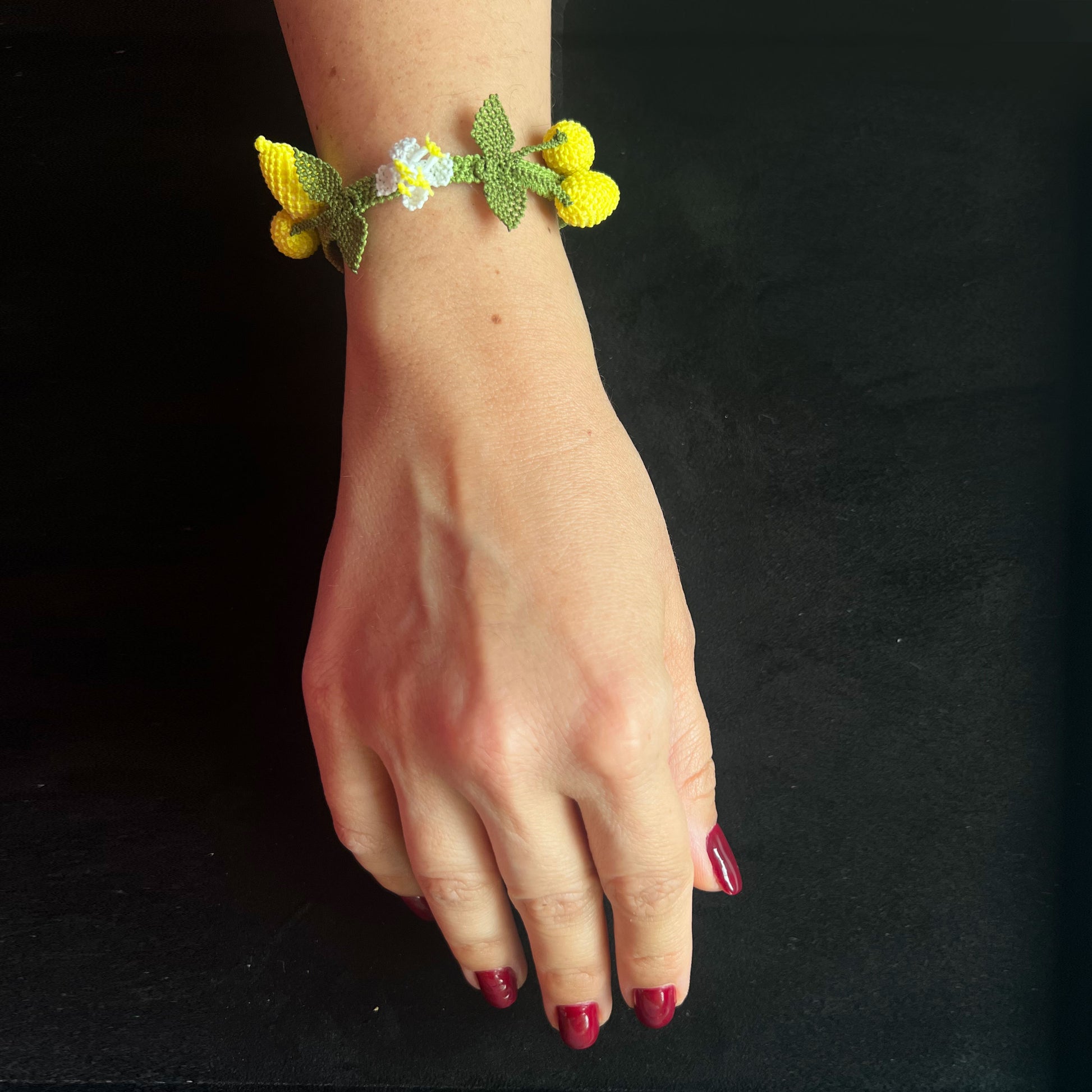 - Canlı sarı limonlar, yeşil yapraklar ve zarif çiçek detayı ile yazın enerjisini bileğinize taşır.