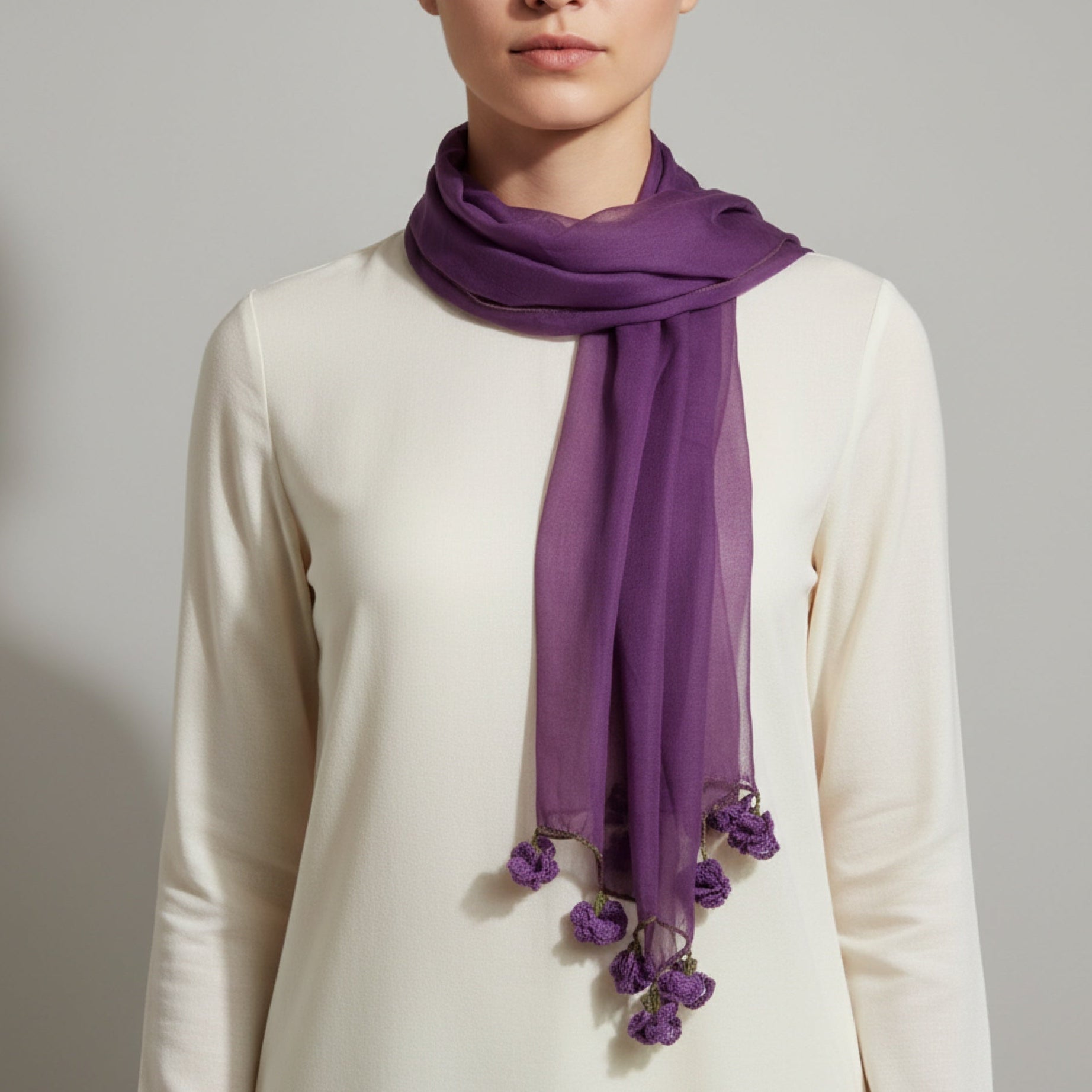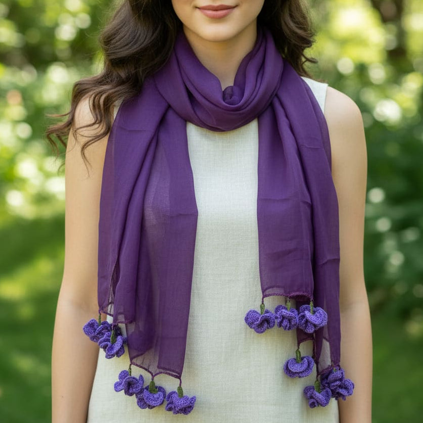 Bu pamuklu fular, el emeğiyle yapılmış mor karanfil oyalarıyla özel bir görünüm sunar. Yumuşak ve nefes alabilen dokusu sayesinde her mevsim rahatça kullanılabilir. Kıyafetlere enerji ve zarafet katar. Günlük kullanım için ideal olduğu gibi anlamlı bir kültürel hediye olarak da tercih edilebilir.