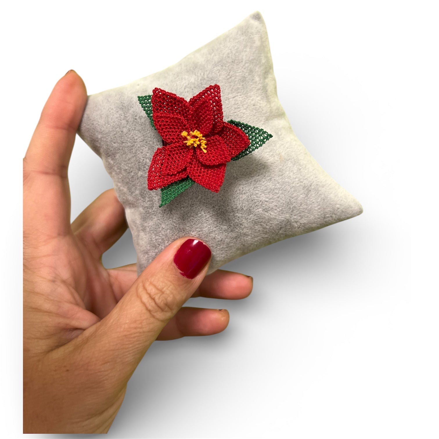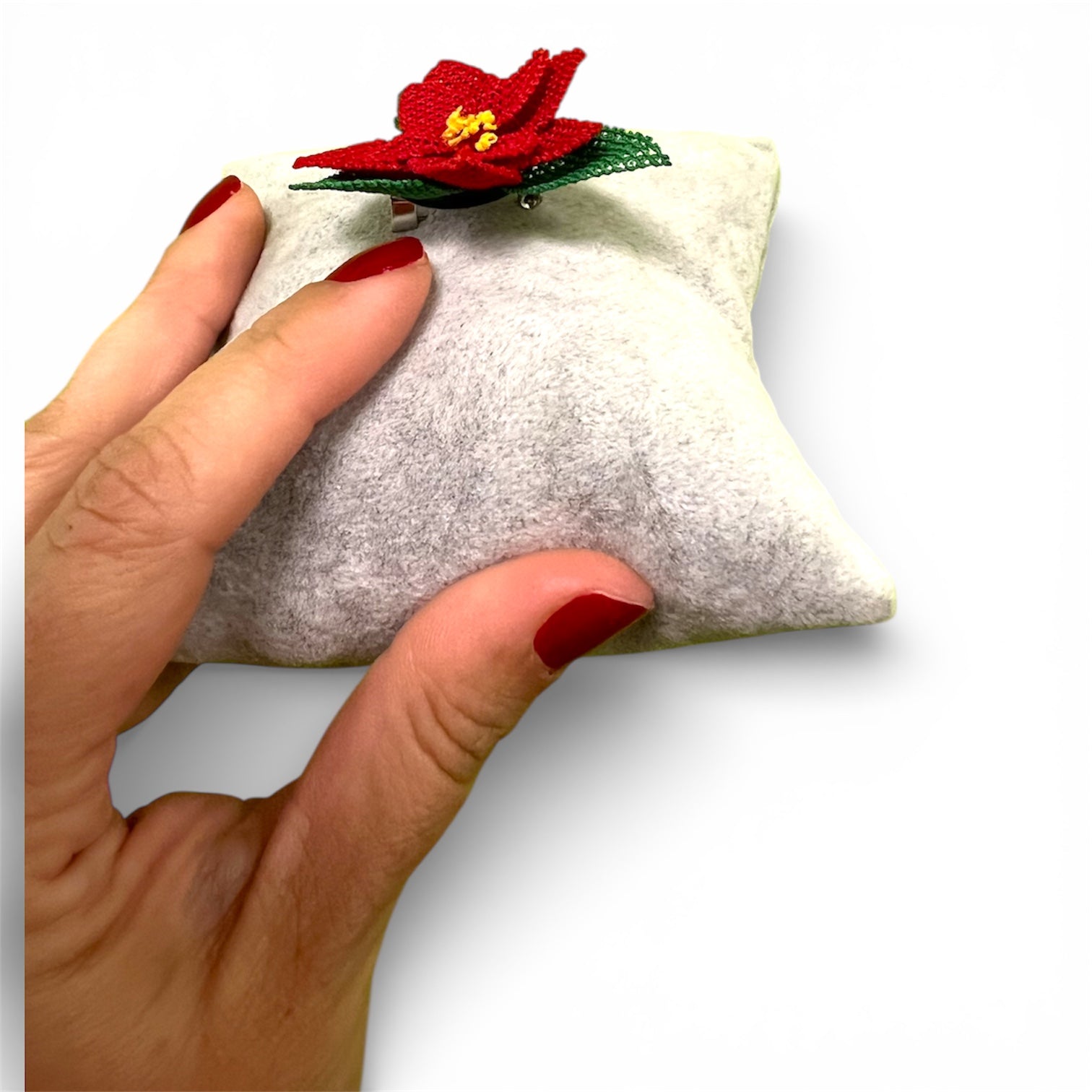 El yapımı yılbaşı broşu, yeni yıl ruhunu zarif ve neşeli bir şekilde yansıtır. Geleneksel kış çiçeği sembollerinden Poinsettia (Atatürk Çiçeği) çiçeklerinden ilham alınarak tasarlanan bu özel broş tamamen elde üretilmiştir.