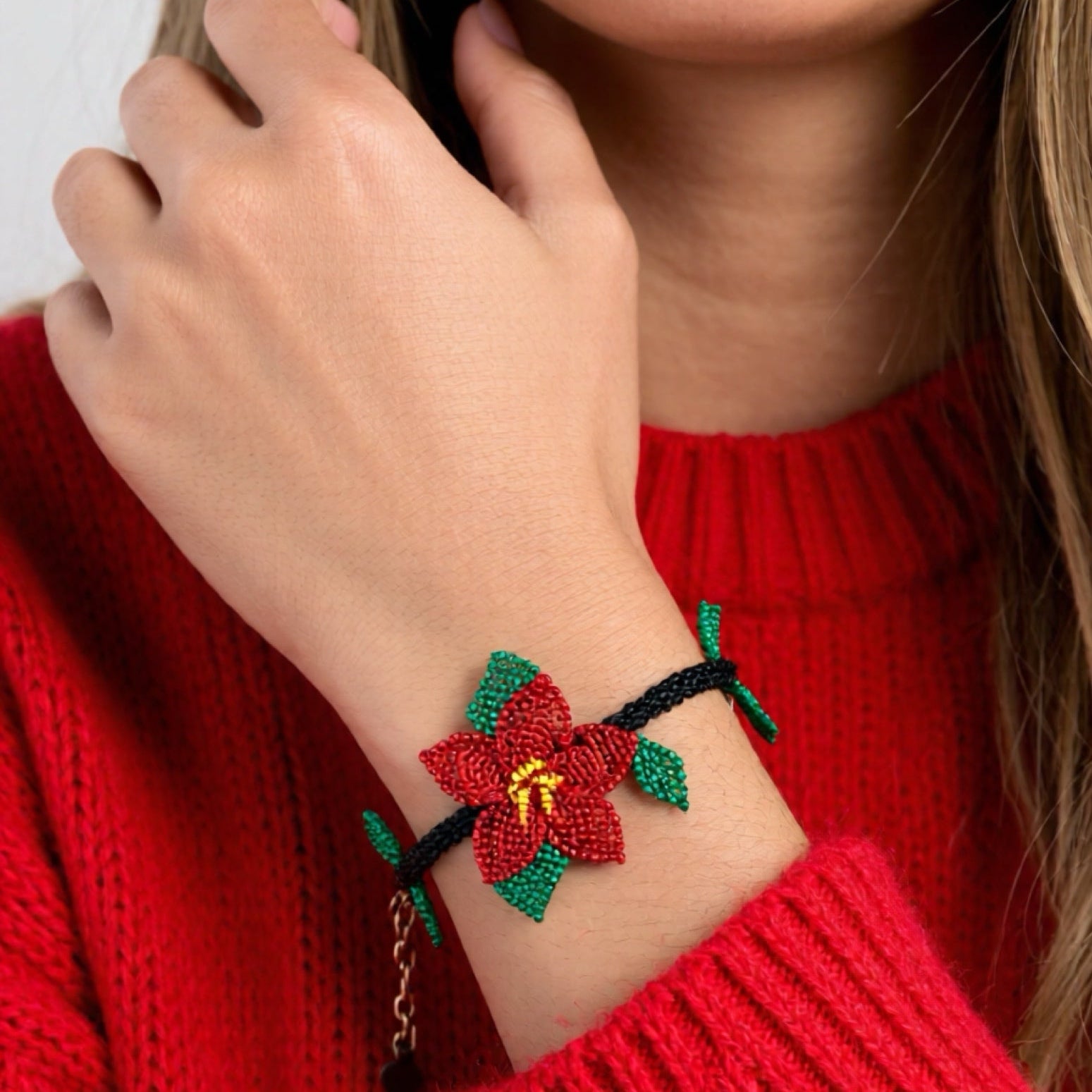 El yapımı yılbaşı küpesi, yeni yıl ruhunu zarif ve neşeli bir şekilde yansıtır. Geleneksel kış çiçeği sembollerinden Poinsettia (Atatürk Çiçeği) çiçeklerinden ilham alınarak tasarlanan bu özel bileklik tamamen elde üretilmiştir.